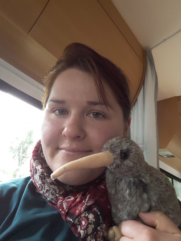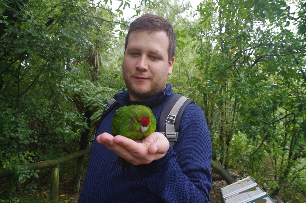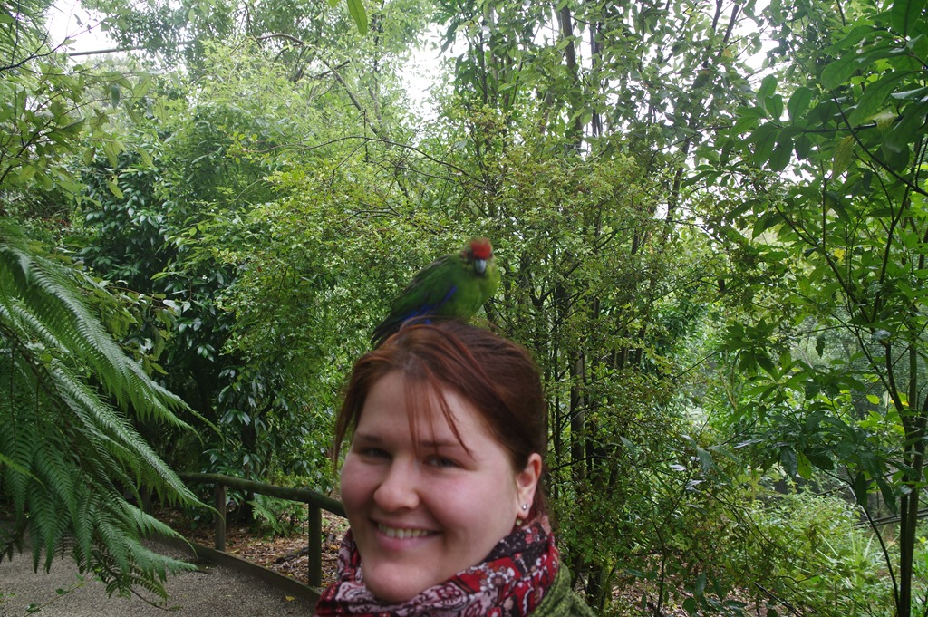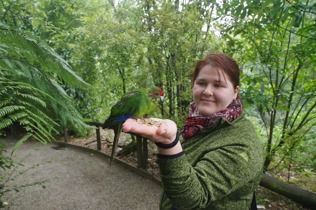 So kommen wir schnell zu unserem Ziel: Dem Kiwihouse. Wir hoffen zwar später noch bei anderen Gelegenheiten auf den etwas kuriosen neuseeländischen Vogel zu treffen – aber hier ist das quasi garantiert. Der Eintritt ist zwar kein Schnäppchen, aber dafür bekommt man noch viele andere einheimische Vögel zu sehen und man tut etwas gutes. Das Kiwihouse wird von einer Stiftung betrieben die sich dem Schutz der bedrohten Vögel verschrieben hat. Außerdem durfte man bei der Fütterung der neuseeländischen Sittiche nicht nur zusehen, sondern auch mitmachen. Das sah dann so aus: (Man beachte, wie hervorragend sich Maria farblich angepasst hat!)